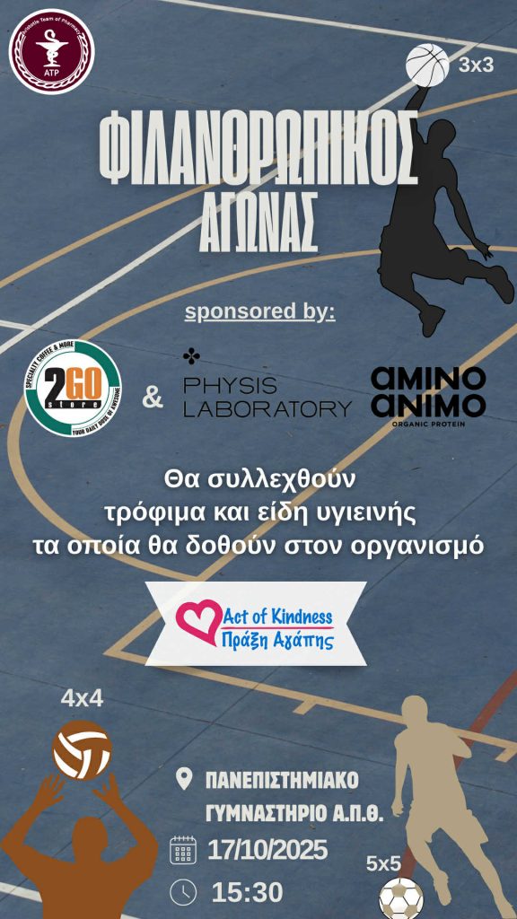 Σας ενημερώνουμε ότι την Παρασκευή 17.10.2025 θα πραγματοποιηθούν αγώνες φιλανθρωπικού χαρακτήρα (ποδοσφαίρου, καλαθοσφαίρισης και πετοσφαίρισης), στο Πανεπιστημιακό Γυμναστήριο, από την ομάδα ATP – Aristotle Team of Pharmacy, μια μη κερδοσκοπική, μη κυβερνητική, μη συνδικαλιστική οργάνωση που δημιουργήθηκε από προπτυχιακούς φοιτητές του Τμήματος Φαρμακευτικής ΑΠΘ.